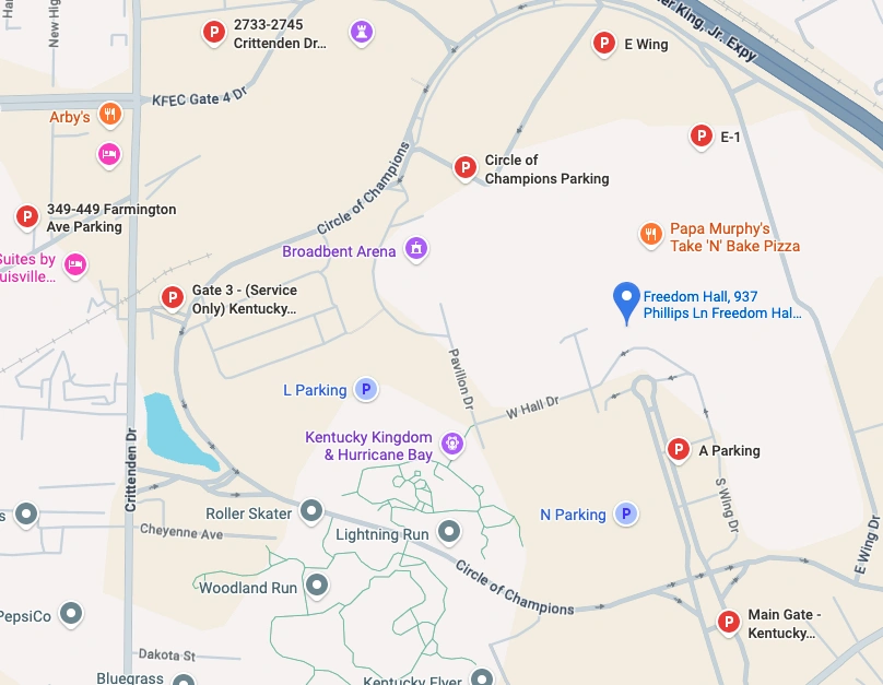 For events in Freedom Hall, the closest parking is located in Lots E or J (located on either side of Cardinal Stadium) which you can access from Ring Road/Circle of Champions.